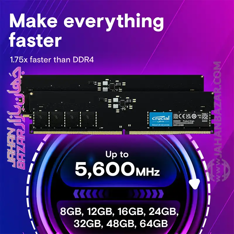 کارایی انرژی: DDR5 بهینه‌سازی‌هایی در مصرف انرژی دارد که به کاهش گرما و افزایش طول عمر سخت‌افزار کمک می‌کند. (رم دسکتاپ کروشیال Crucial 32GB(2×16) DDR5 5600Mhz CL46)