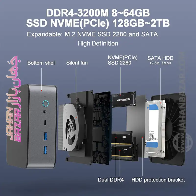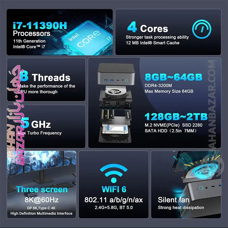 انتقال پرسرعت با WifI6 و BT5.0: این مینی کامپیوتر با ۲ پورت اترنت گیگابیت RJ45 با سرعت ۲.۵ گیگاهرتز. و WiFi 6 سه برابر سریعتر از WiFi 5 است و دیگر در محل کار قطع نمیشود. علاوه بر این، میکرو کامپیوتر با BT5.0 برای اتصال دستگاههایی مانند ماوس یا کیبورد بیسیم که حساستر و سریعتر است، ارائه میشود.