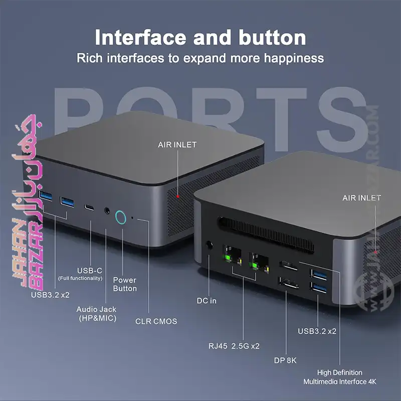 پورت چند منظوره: این محصول مجهز به ۱ جک DC، ۴ پورت USB3.2، ۲ پورت RJ45 2.5G، ۱ رابط High Definition 4K، ۱ پورت DP 8K، ۱ جک xo (HP&MIC)، ۱ پورت Type-C Thunderbolt 4 است که نیازهای اتصال دستگاههای مختلف را برآورده میکند.