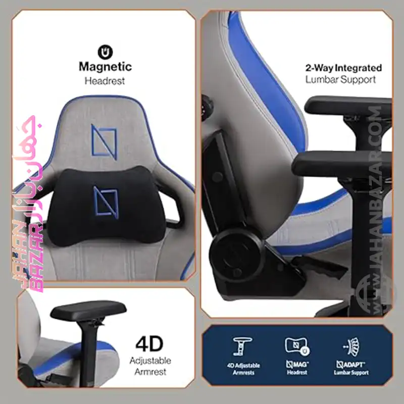 بالشتکهای فوم (Memory Foam) برای نشیمن و هدری بهصورت مغناطیسی که بهسادگی قابل تنظیم روی صندلی است.