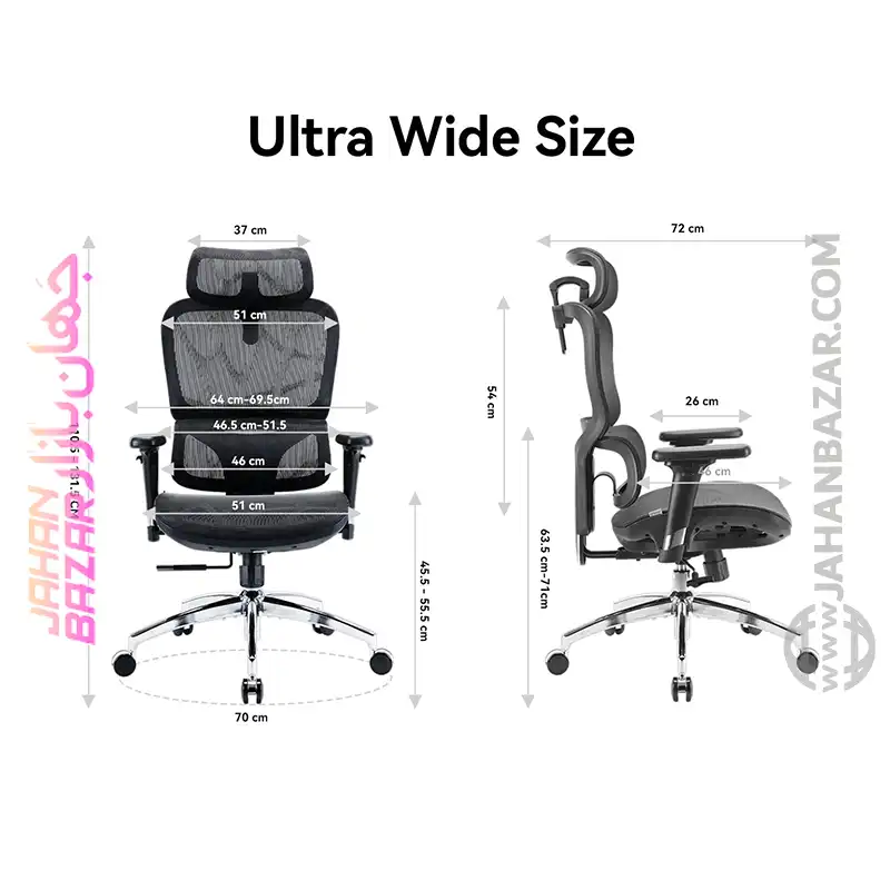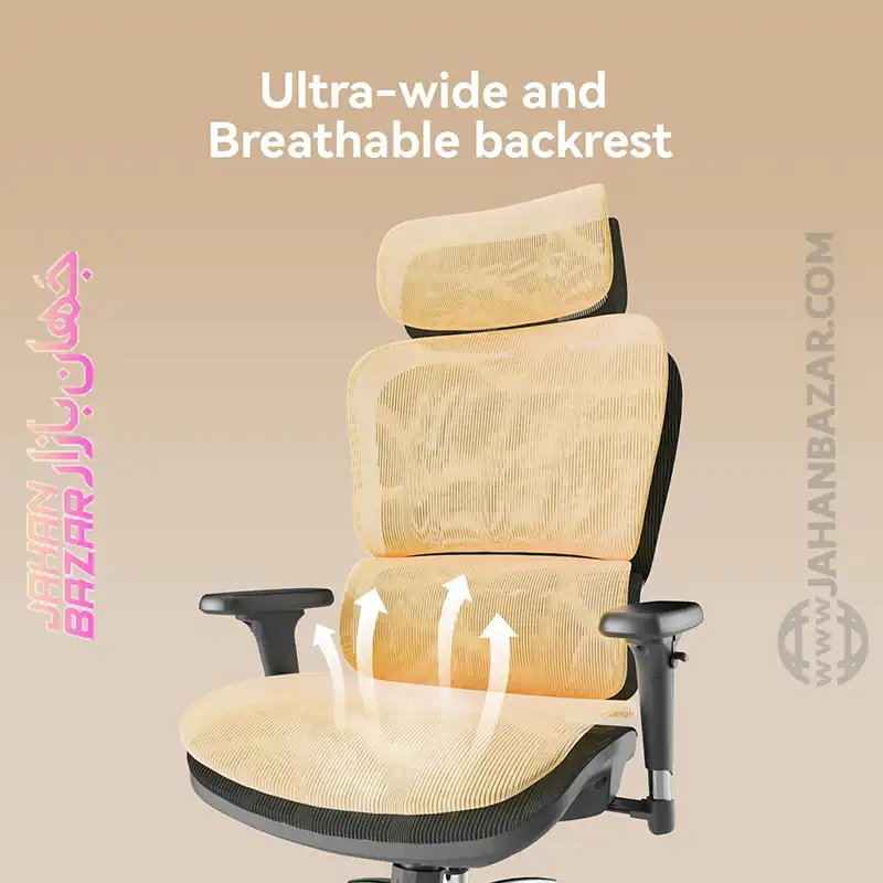📌 پشتی بلند و پهن: پشتی صندلی بهصورت پهـن و بلند طراحی شده که کل پشت بدن را حمایت میکند و در کاهش خستگی در جلسات طولانی کمک میکند.