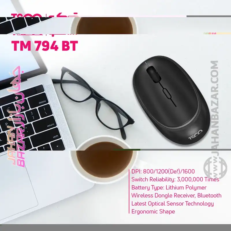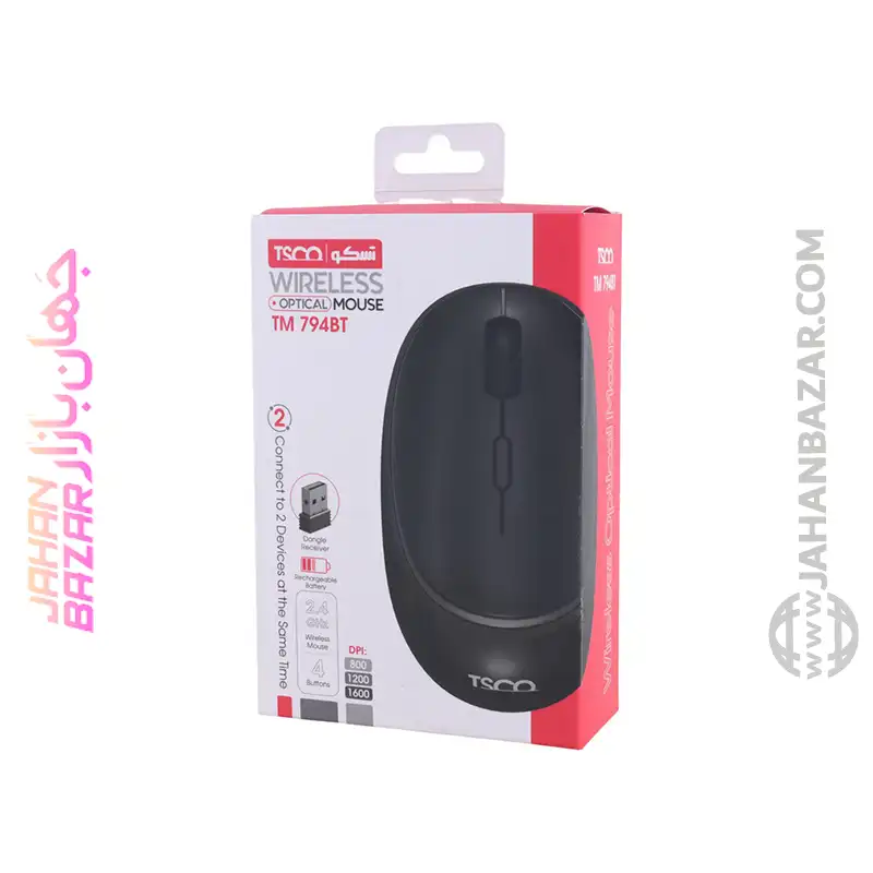 ماوس TSCO TM 794BT یک ماوس بی‌سیم بلوتوثی با طراحی مدرن و ارگونومیک است که برای کاربری روزمره، اداری و حتی استفاده همراه با لپ‌تاپ یا تبلت بهینه شده است. این ماوس بدون نیاز به دانگل USB و تنها از طریق اتصال بلوتوث به دستگاه‌های سازگار وصل می‌شود و همین موضوع آن را گزینه‌ای ایده‌آل برای کاربرانی می‌سازد که پورت‌های USB محدودی دارند یا تمایلی به استفاده از گیرنده فیزیکی ندارند.